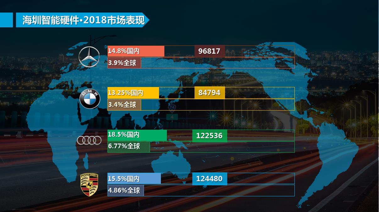 據一份來自海圳汽車內部的數據顯示,2018年,海圳奔馳專車專用記錄儀銷量占國內奔馳新車銷量的14.8%,占全球奔馳新車銷量的3.9%;海圳寶馬專車專用記錄儀銷量占國內奔馳新車銷量的13.25%,占全球奔馳新車銷量的3.4%;海圳奧迪專車專用記錄儀銷量占國內奔馳新車銷量的18.5%,占全球奔馳新車銷量的6.77%。